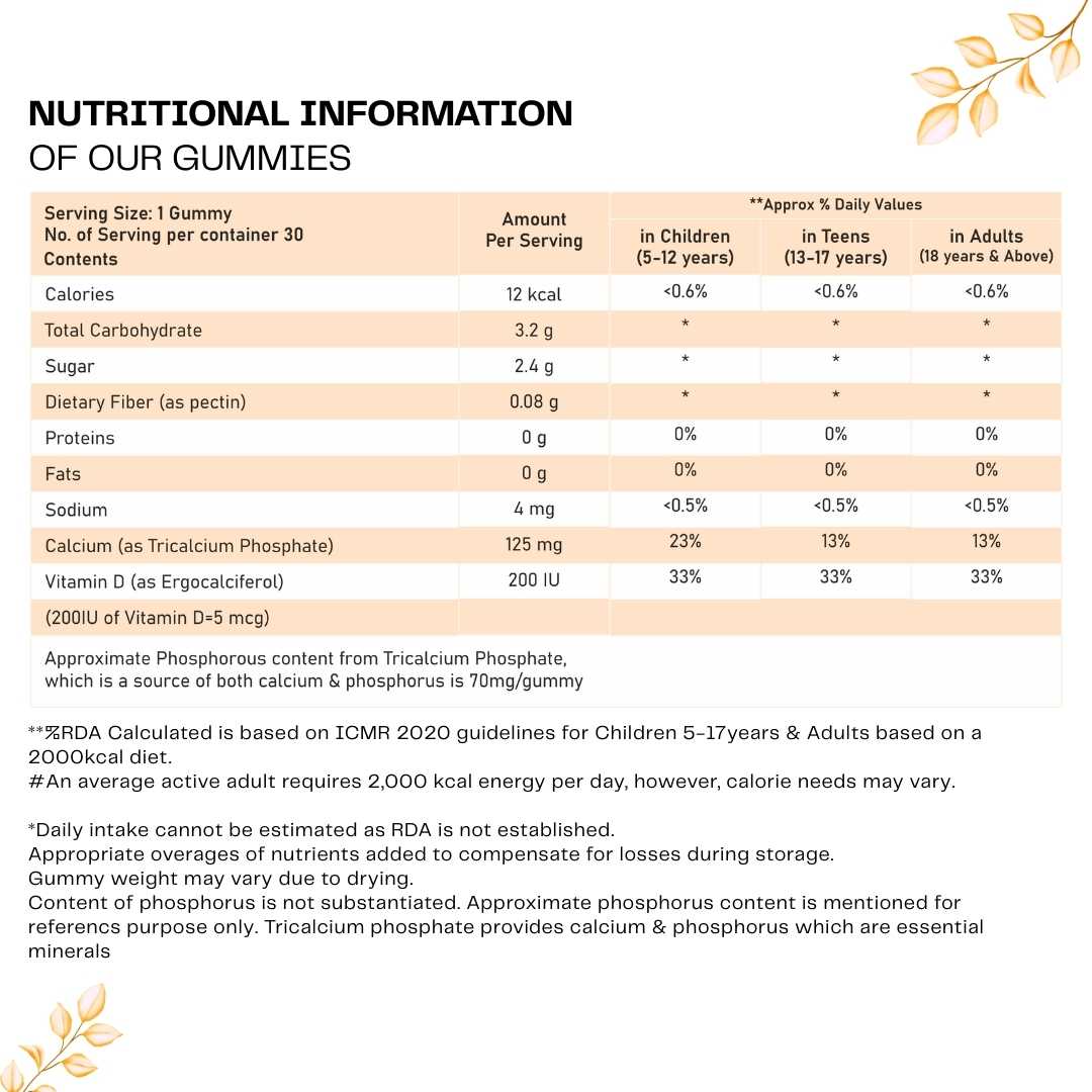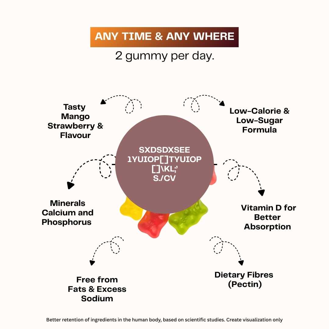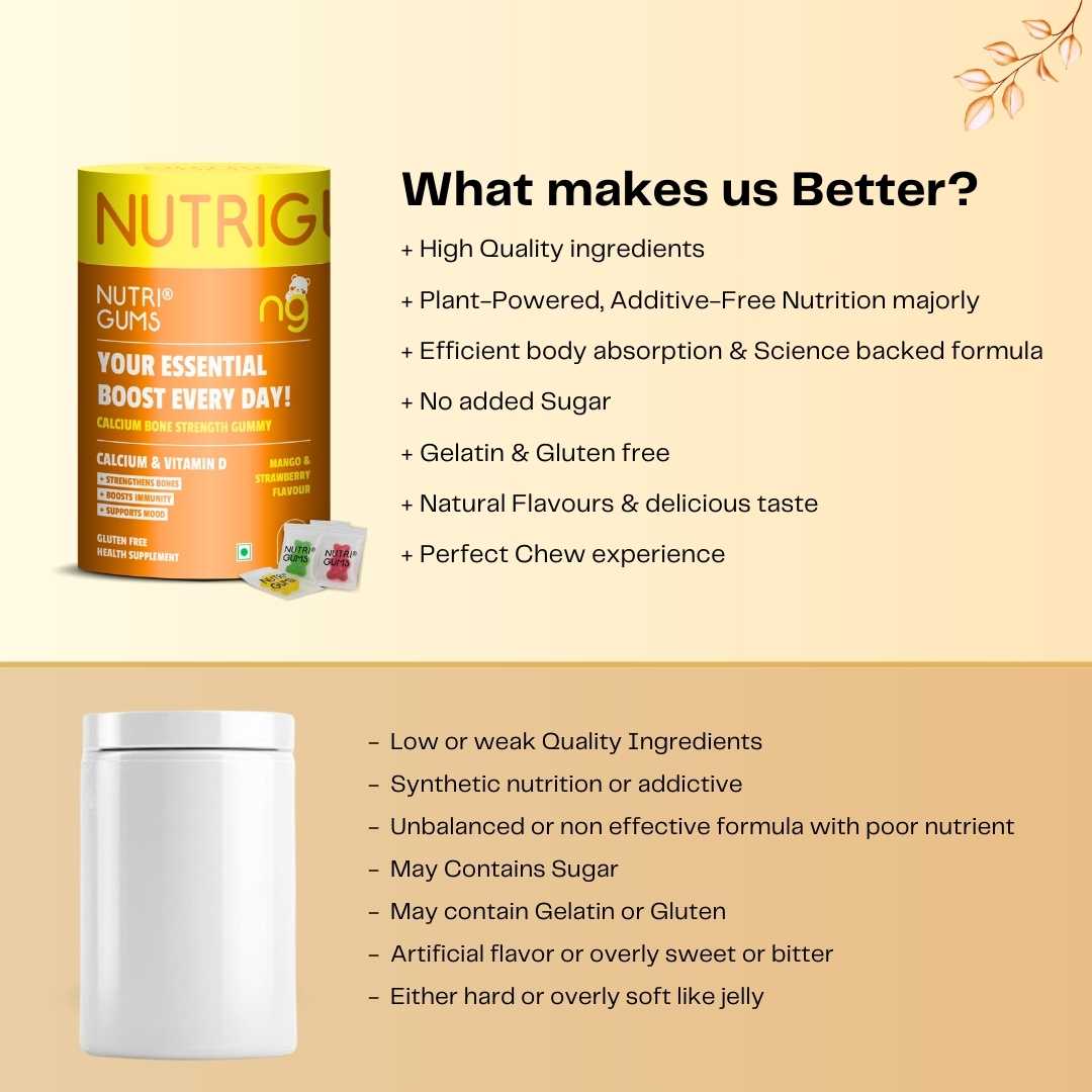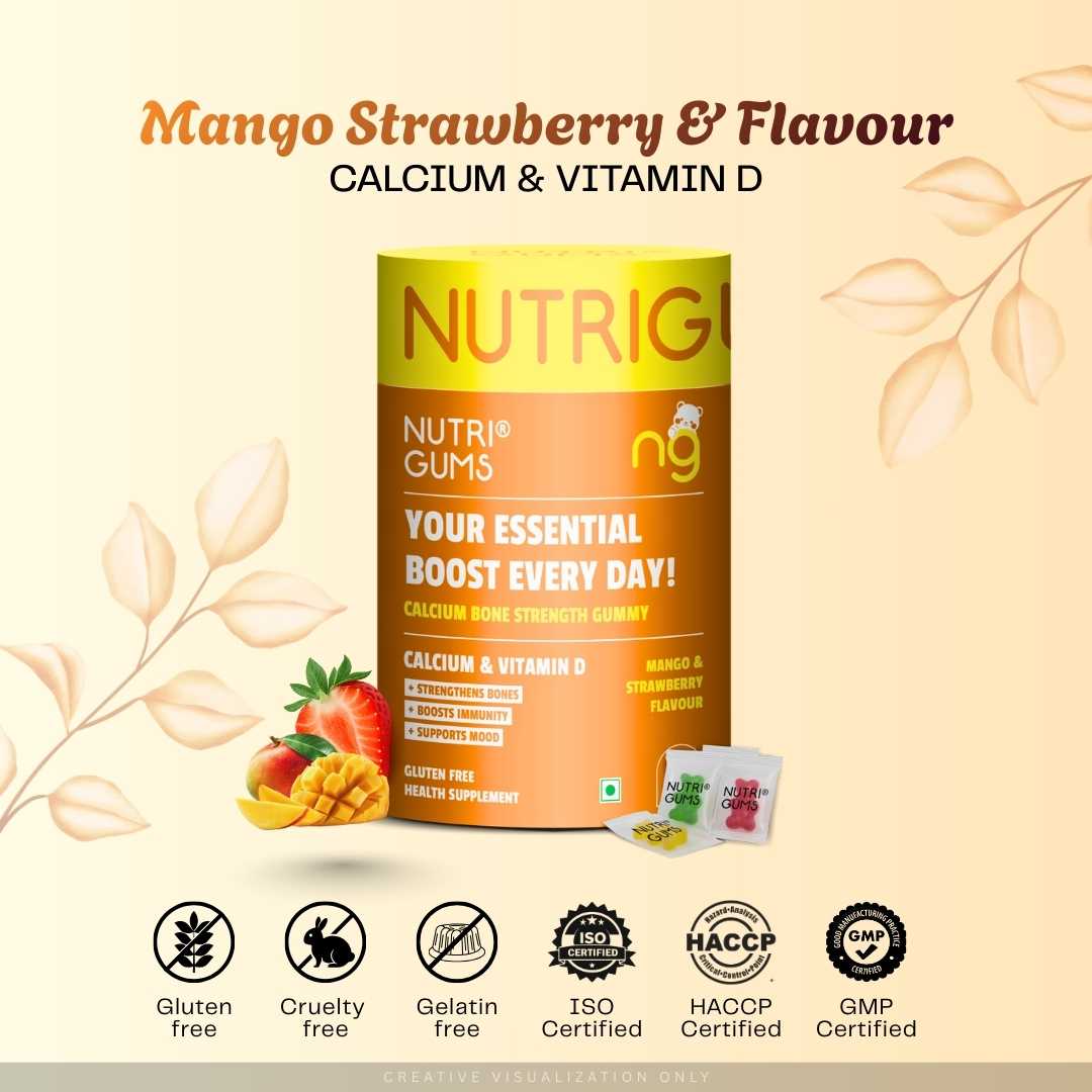 Nutrigums Calcium Bone Strength Gummy is a daily essential supplement designed to support strong bones, healthy joints, better immunity, and balanced mood. Powered with Calcium + Vitamin D3, these gummies help improve bone density, increase calcium absorption, and promote muscle and joint health.