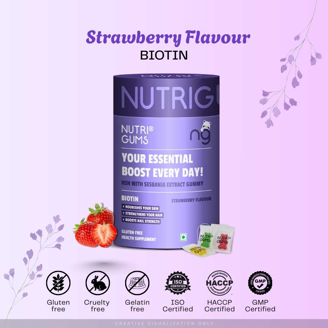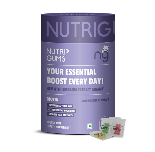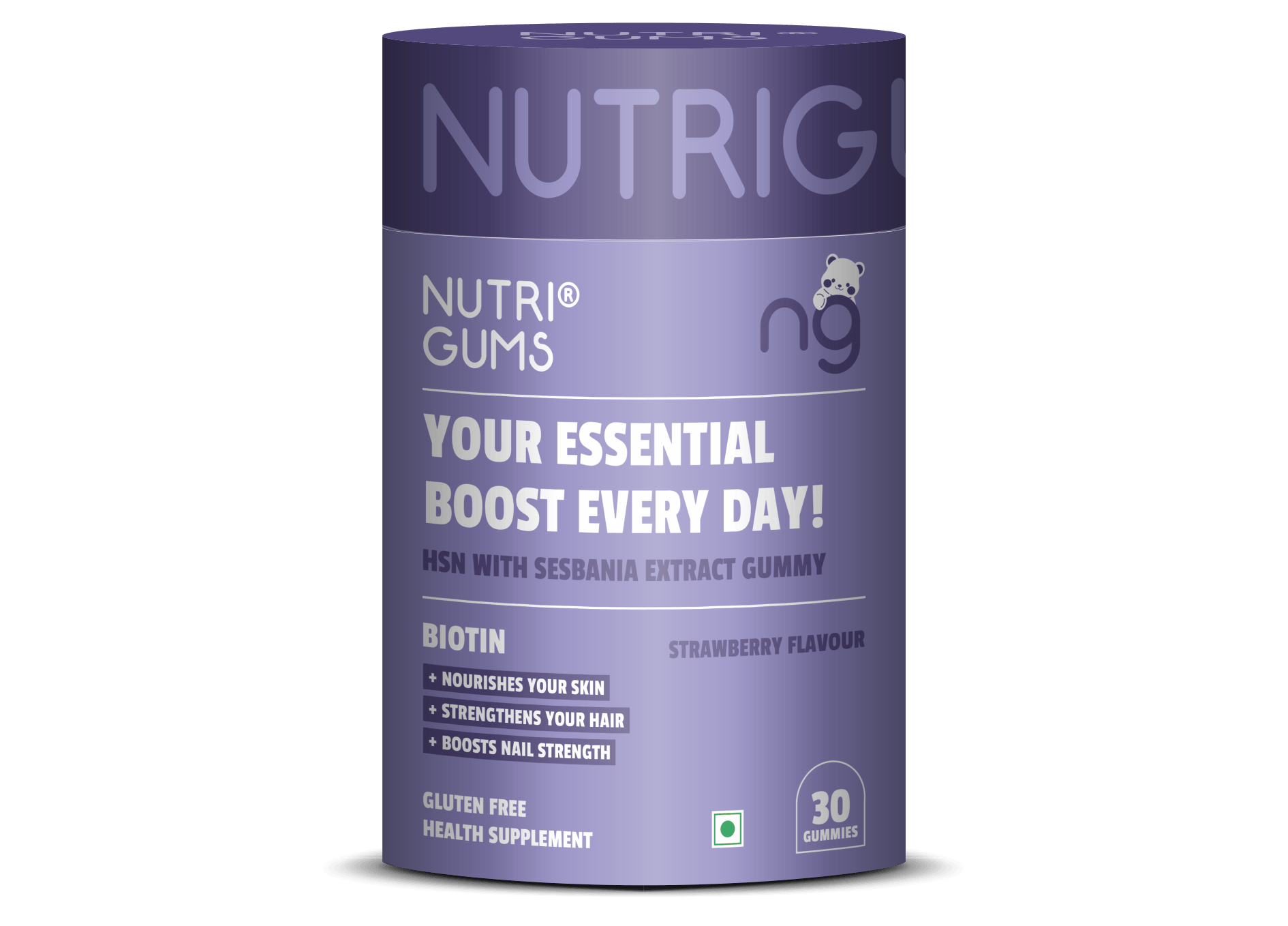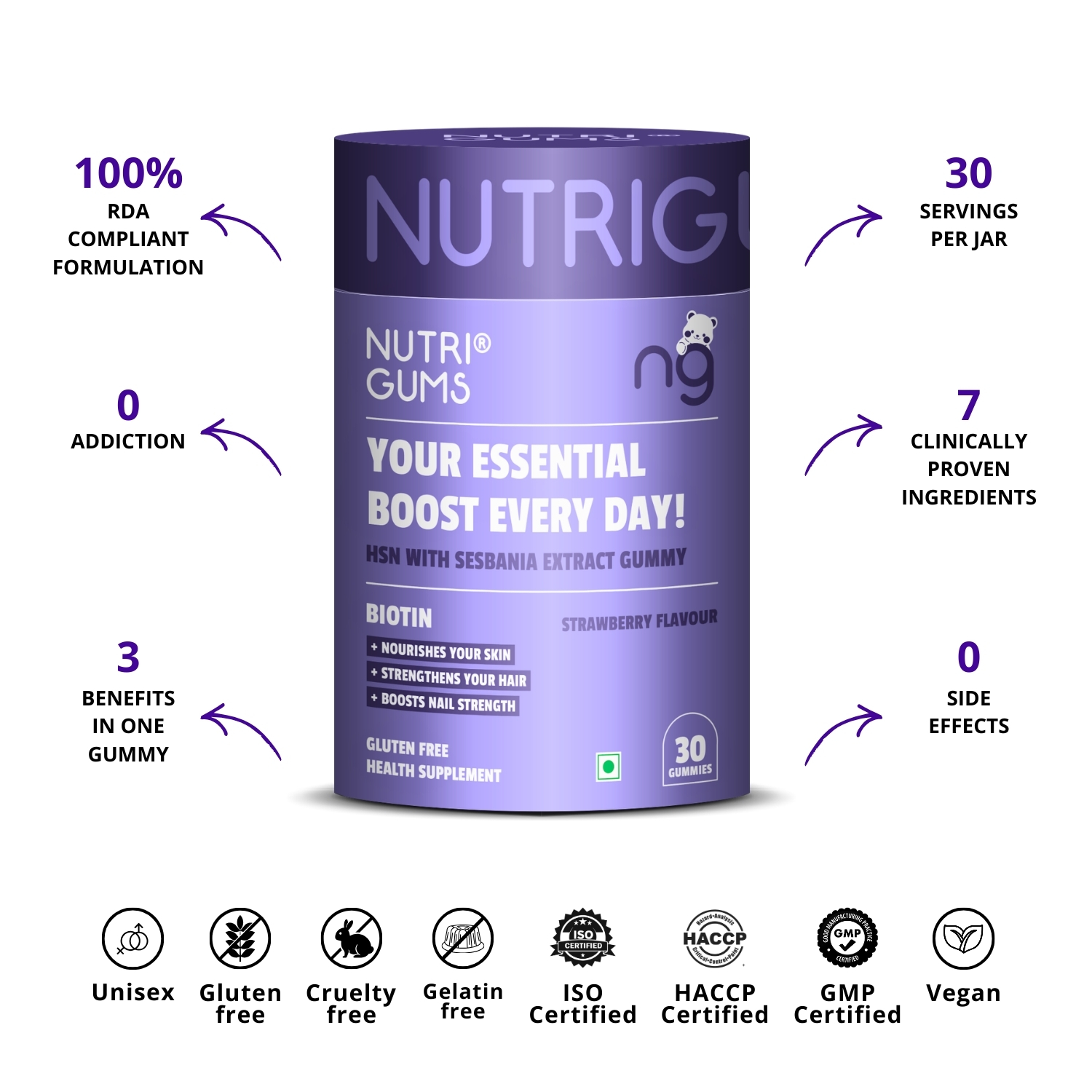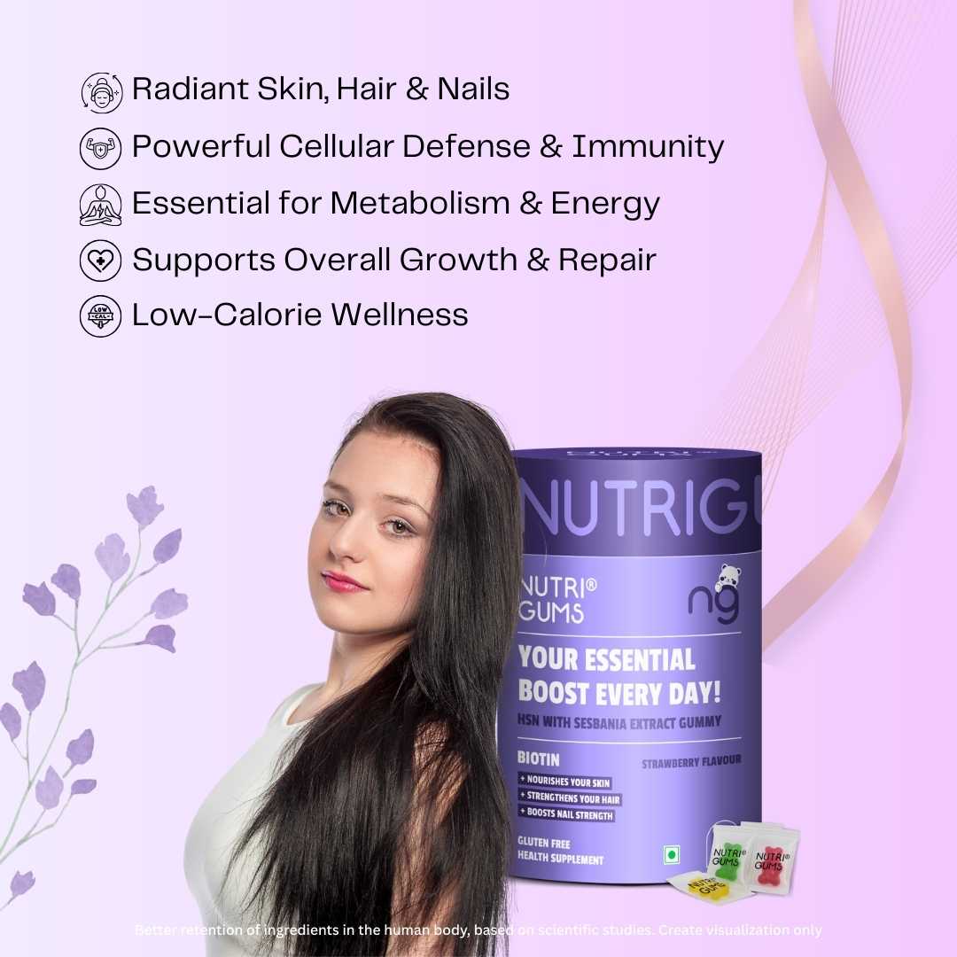 NutriGums HSN Gummies combine Biotin and Sesbania Extract to nourish skin, strengthen hair, and boost nail health. These gluten-free strawberry-flavoured gummies support daily beauty nutrition with essential ingredients that help improve shine, texture, and overall growth.
