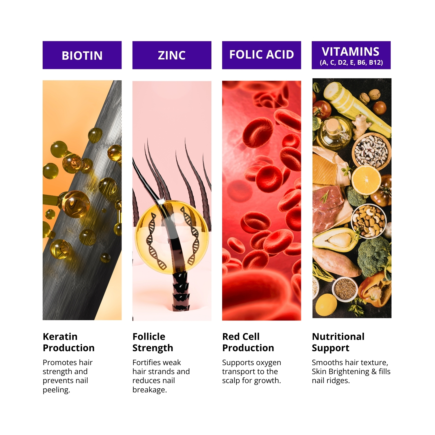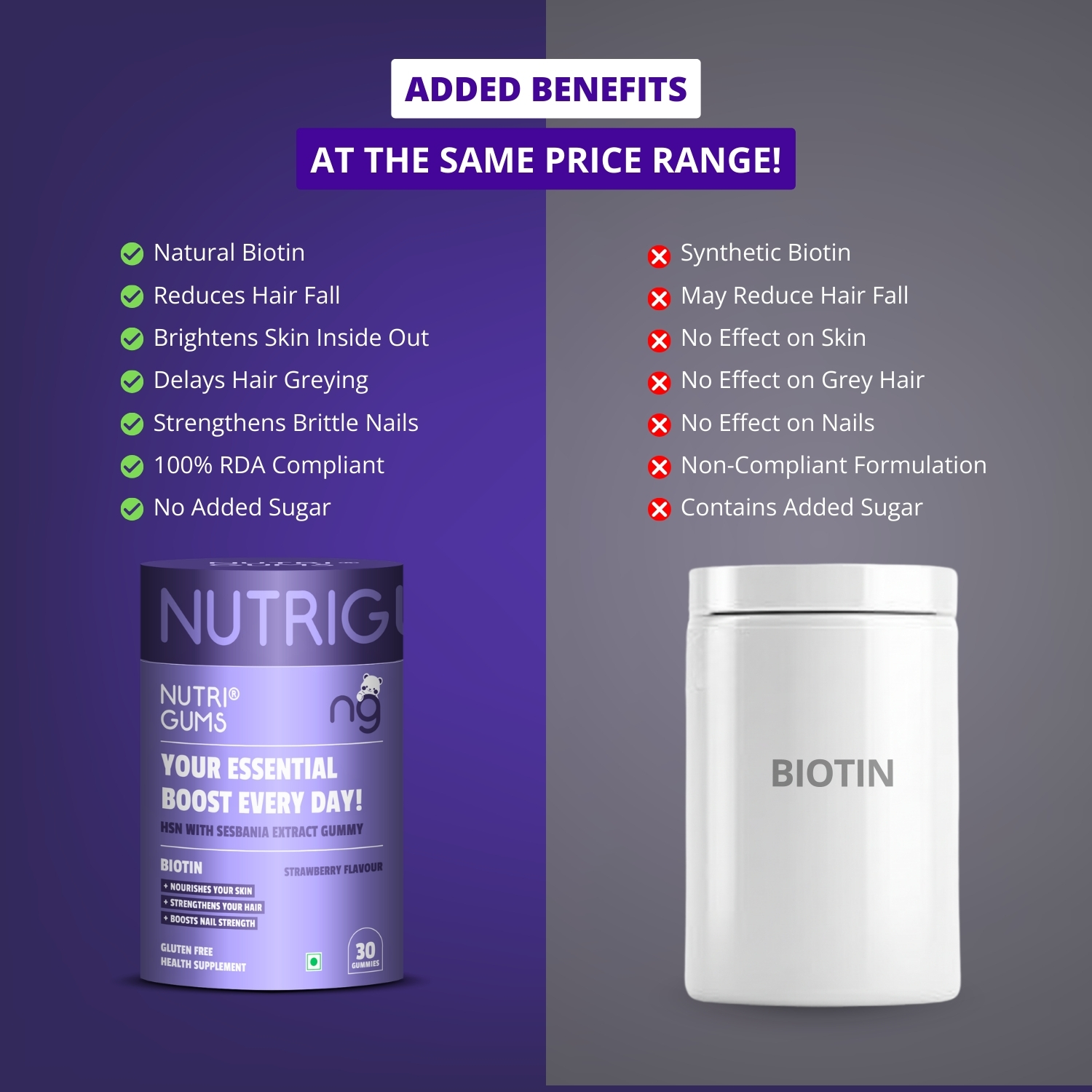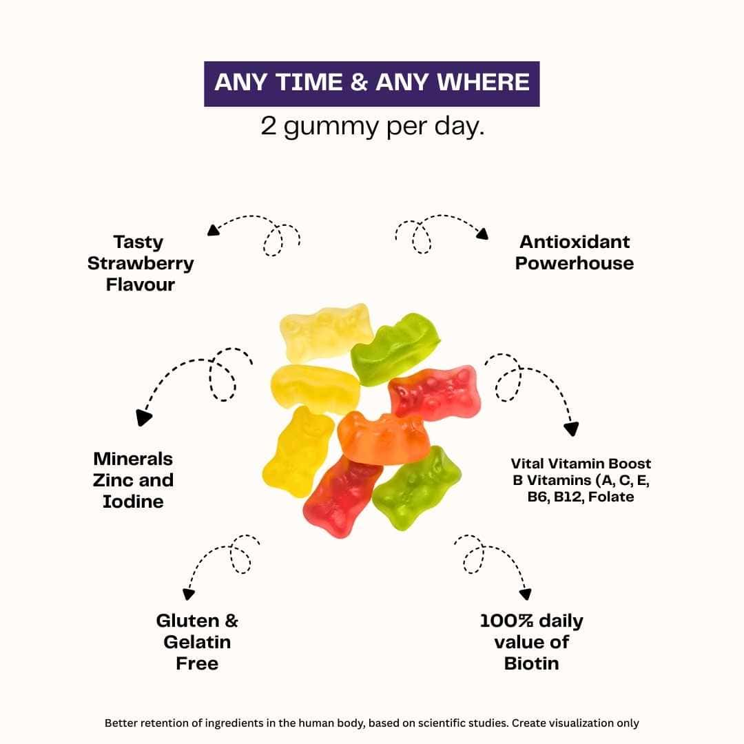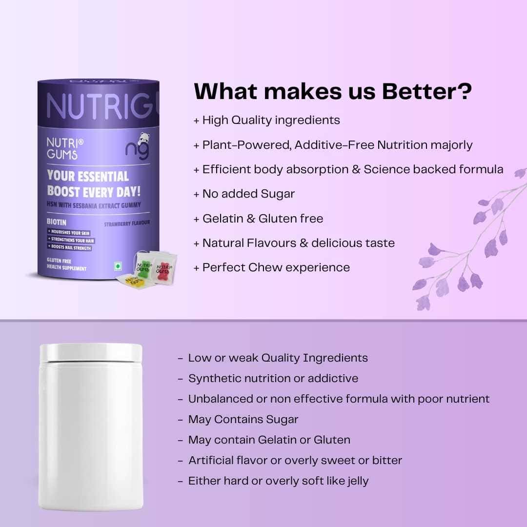 NutriGums HSN Gummies combine Biotin and Sesbania Extract to nourish skin, strengthen hair, and boost nail health. These gluten-free strawberry-flavoured gummies support daily beauty nutrition with essential ingredients that help improve shine, texture, and overall growth.