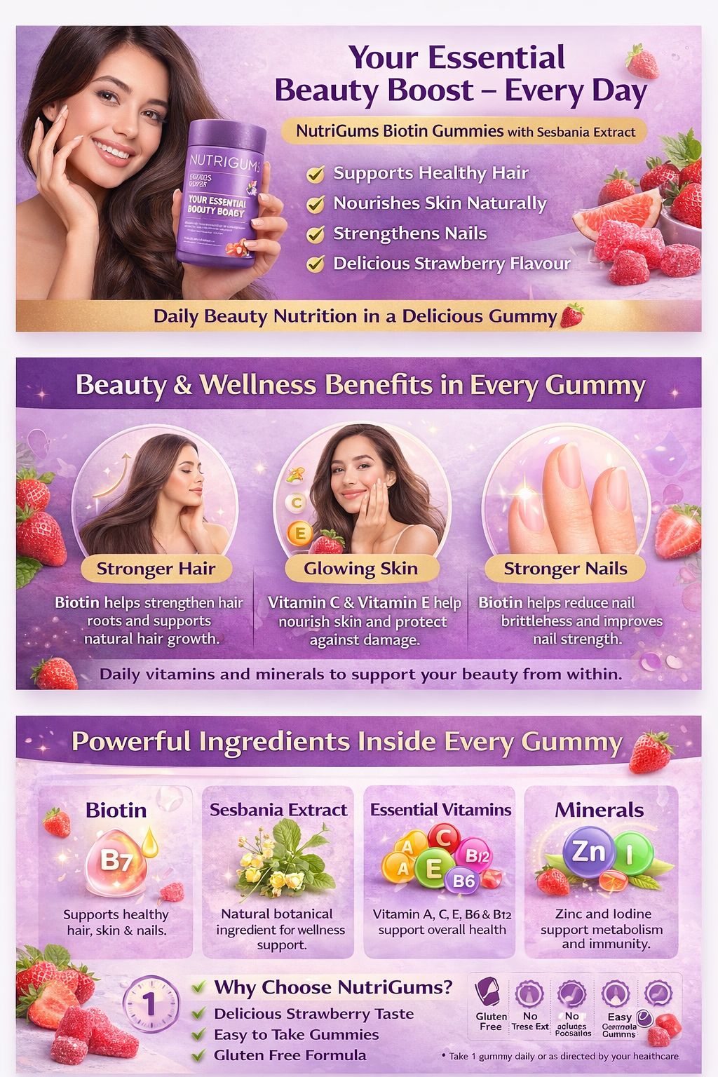 NutriGums HSN Gummies offer a convenient and tasty way to support your daily beauty routine. Packed with Biotin and Sesbania Extract, they promote healthy hair, glowing skin, and stronger nails. Perfect for anyone wanting a natural, effective, and enjoyable supplement for overall beauty wellness.