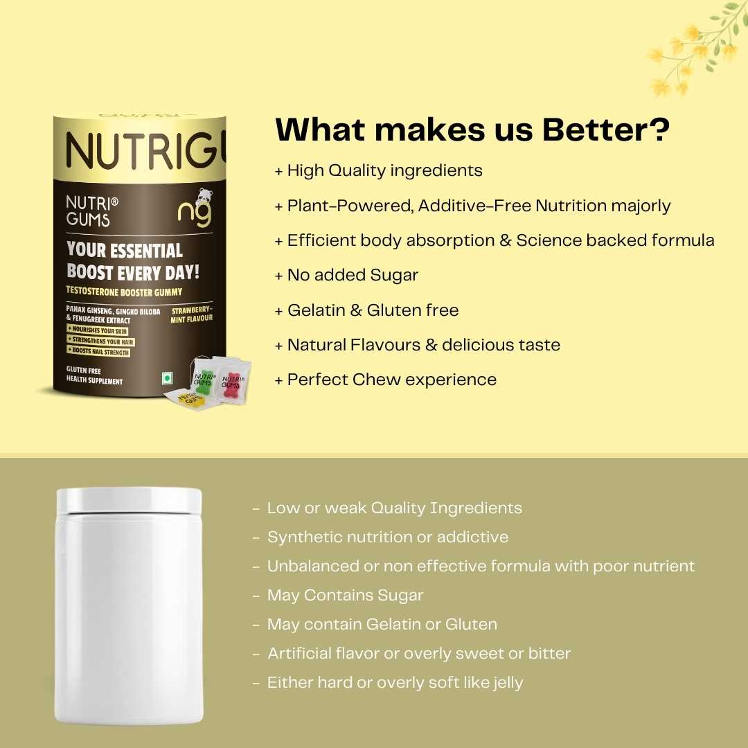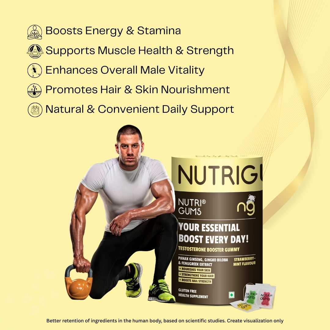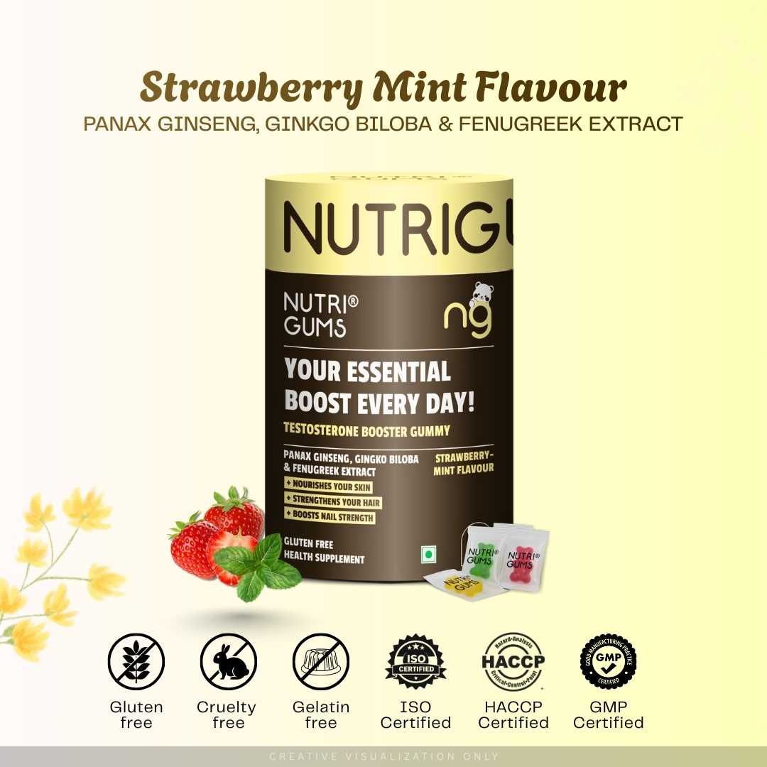 NutriGums Testosterone Booster Gummies combine Panax Ginseng, Gingko Biloba, and Fenugreek to naturally support vitality, stamina, and hormone balance. These gluten-free gummies also nourish skin, strengthen hair, and boost nail health while offering a refreshing strawberry-mint flavour for daily wellness.