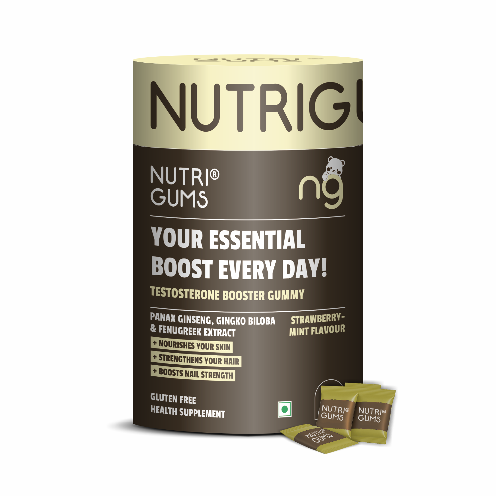 NutriGums Testosterone Booster Gummies combine Panax Ginseng, Gingko Biloba, and Fenugreek to naturally support vitality, stamina, and hormone balance. These gluten-free gummies also nourish skin, strengthen hair, and boost nail health while offering a refreshing strawberry-mint flavour for daily wellness.